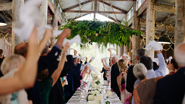 The barn is the standout. Built from recycled timber, it carries warmth in both colour and character. Large doors open to the landscape, letting the light in during speeches and closing later as the dance floor takes over. It is the kind of space where laughter echoes and energy builds naturally, ideal conditions for storytelling.